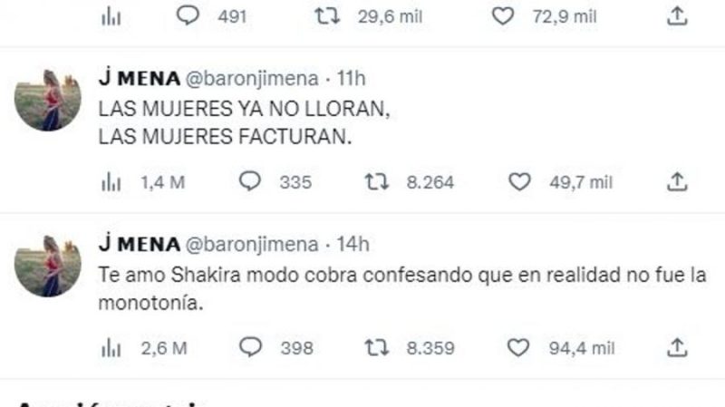 “Te amo Shakira modo cobra confesando que en realidad no fue la monotonía”, arrancó diciendo Jimena Barón (A.K.A La Cobra que se cobra todo bebé) en su cuenta de Twitter apenas tuvo estado público la Music Session 53 donde Shak descarga todo su arsenal contra Piqué tras su infidelidad y escandalosa separación. “Las mujeres ya no lloran, las mujeres facturan”, canta la canción de Shak la intérprete de explosivos temas como La Cobra, La Tonta, La Araña, entre otros.