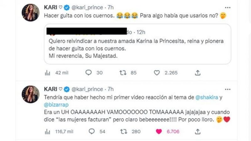 Cuando una seguidora de la referente de la cumbia expuso “Quiero reivindicar a nuestra amada Karina la Princesita, reina y pionera de hacer guita con los cuernos. Mi reverencia, Su Majestad”, la cantante respondió: “Hacer guita con los cuernos. ¿Para algo había que usarlos no?”, concluyó la intérprete de glorias musicales como Sinvergüenza, Corazón mentiroso y Con la misma moneda, entre otros.