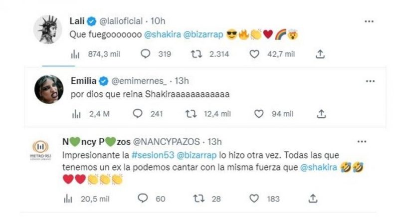Por supuesto, ellas no fueron las únicas en reaccionar a la bomba musical de Shakira y Bizarrap. Lali Espósito bancó al 100% el tema: “Que fuegooooooo @shakira @bizarrap”. La referente del trap Emilia Mernes también se unió a la causa: “por dios que reina Shakiraaaaaaaaaaa”.