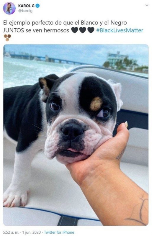 Karol G recibió duras críticas en las redes sociales después de publicar una foto de su perro para expresarse contra el racismo, en medio de la ola de protestas por la muerte a manos de la Policía del afroamericano George Floyd en los Estados Unidos.