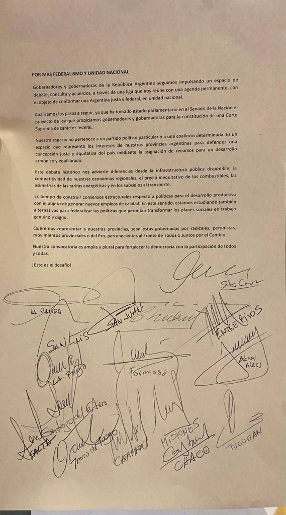 Según detallaron, tiene como objetivo alcanzar «más federalismo y unidad nacional», en medio de una puja con la ciudad de Buenos Aires por la distribución de recursos y con el impulso de un proyecto de ley para modificar la composición de la Corte Suprema de Justicia.