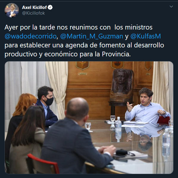 “Ayer por la tarde nos reunimos con los ministros Wado de Pedro, Martín Guzmán y Matías Kulfas para establecer una agenda de fomento al desarrollo productivo y económico para la Provincia”, posteó hoy Kicillof en la red social Twitter.