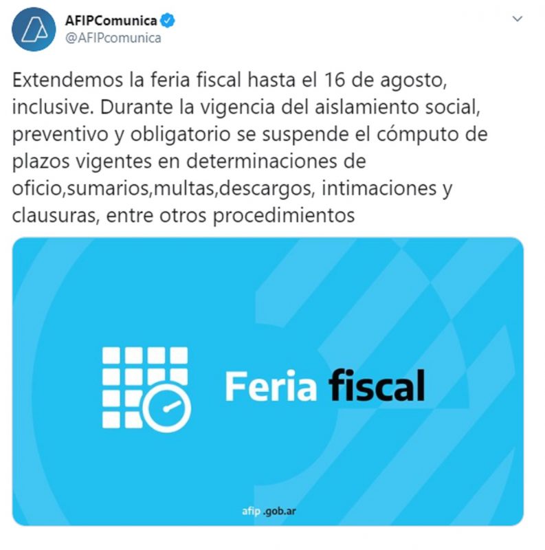 A través de las redes, la AFIP anunció: “Extendemos la feria fiscal hasta el 16 de agosto, inclusive. Durante la vigencia del aislamiento social, preventivo y obligatorio se suspende el cómputo de plazos vigentes en determinaciones de oficio,sumarios,multas,descargos, intimaciones y clausuras, entre otros procedimientos”.