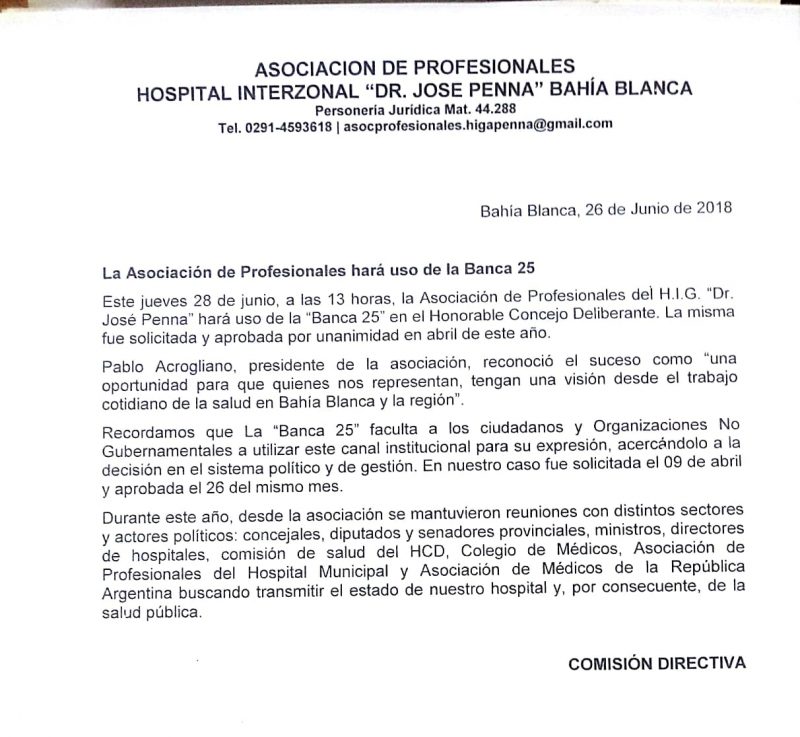 La Asociación de Profesionales del Hospital Penna utilizó la Banca 25 del Concejo Deliberante