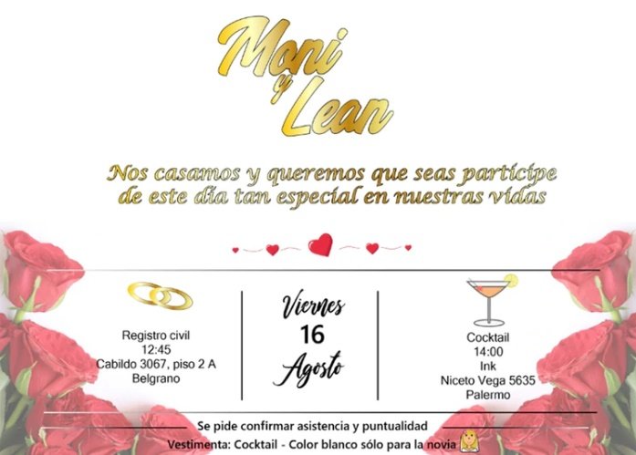 El único pedido para los invitados de la boda es: “Si querés hacernos más felices con un lindo gesto, podés aportar para nuestra luna de miel“, aclara la pareja en su tarjeta.