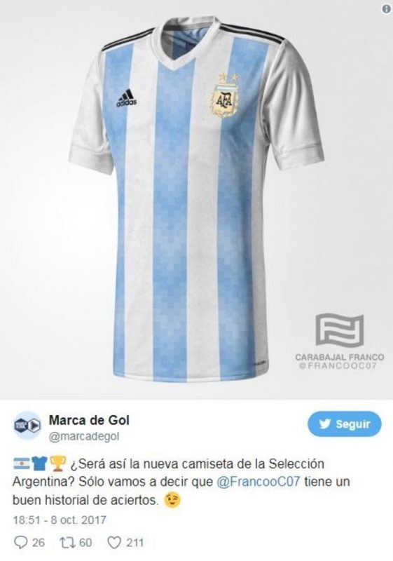 Antes del encuentro ante Ecuador, y de que la Selección lograra la clasificación al Mundial, ya había circulado una imagen de la nueva camiseta titular, que también presentará cambios en Rusia. La misma tiene un aspecto retro, y parece estar inspirada en la que se utilizó en la Copa América de 1993, cuando el equipo argentino logró su último título en mayores.