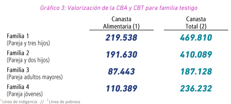 Por su parte, la Canasta Básica Total (CBT) para la misma familia alcanzó los $ 410.089, que son necesarios para cubrir sus consumos básicos, tanto alimentarios como no alimentarios, y así superar el umbral de pobreza.