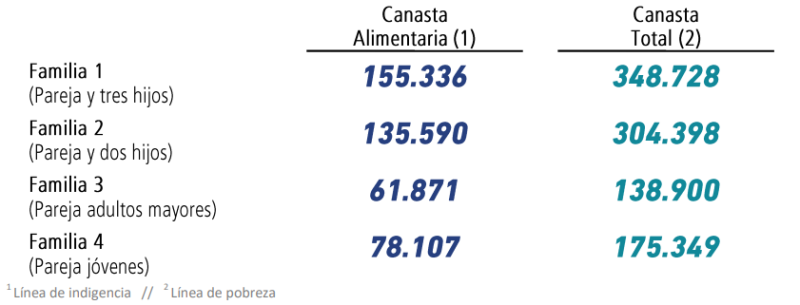 Por su parte, la Canasta Básica Total (CBT) para la misma familia alcanzó los $ 304.398, que son necesarios para cubrir sus consumos básicos, tanto alimentarios como no alimentarios, y así superar el umbral de pobreza.