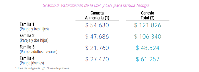 Por su parte, la canasta básica total para la misma familia alcanzó los $ 106.340, que son necesarios para cubrir sus consumos básicos, tanto alimentarios como no alimentarios, y así superar el umbral de pobreza.