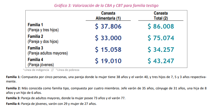 Por su parte, la Canasta Básica Total (CBT) para la misma familia alcanzó los $75.074, que son necesarios para cubrir sus consumos básicos, tanto alimentarios como no alimentarios, y así superar el umbral de pobreza.