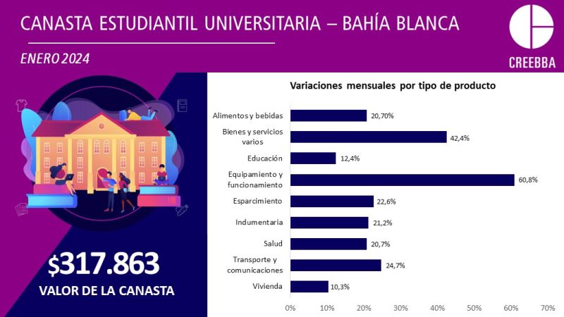 El Centro Regional de Estudios Económicos de Bahía Blanca informó este lunes que “en el mes de enero la variación de la canasta que mide el costo mensual de vivir en Bahía Blanca y estudiar en la Universidad del Sur para un estudiante de la región fue de 18,8%”.