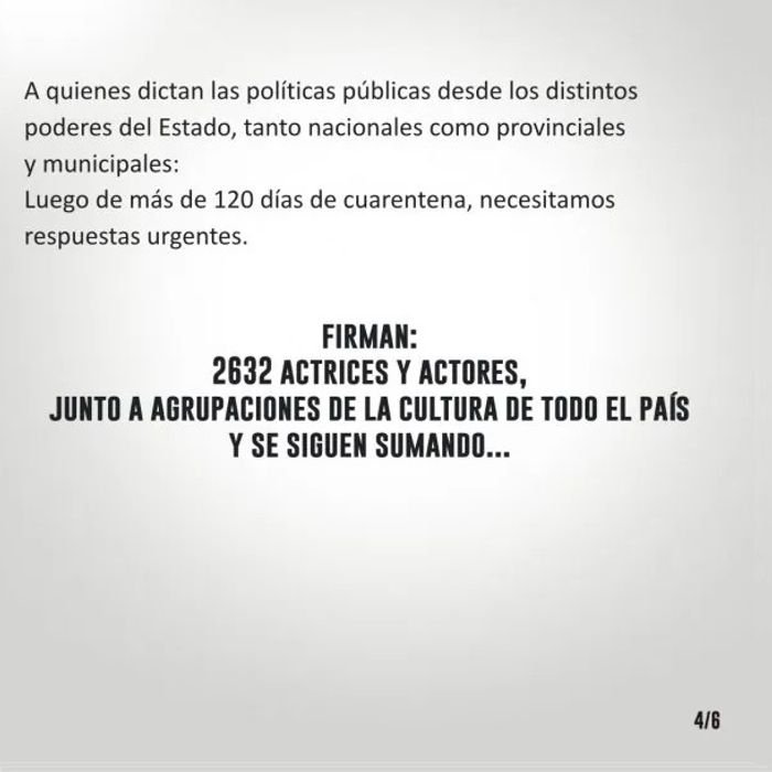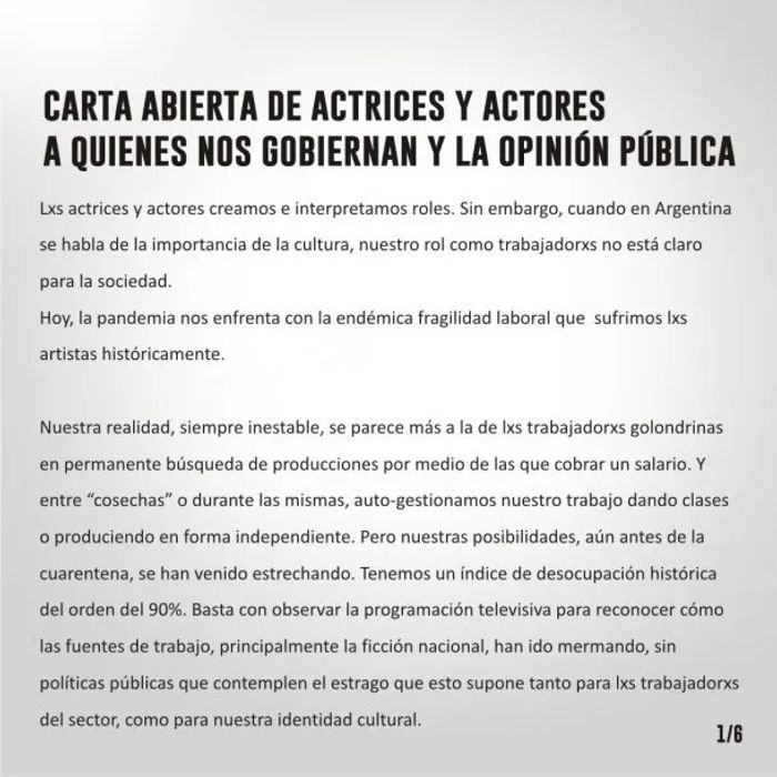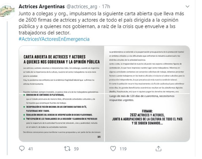 Junto a colegas y org., impulsamos la siguiente carta abierta que lleva más de 2600 firmas de actrices y actores de todo el país dirigida a la opinión pública y a quienes nos gobiernan, a raíz de la crisis que envuelve a lxs trabajadorxs del sector. #ActricesYActoresEnEmergencia“, se indicó desde la cuenta de Twitter de Actrices Argentinas.