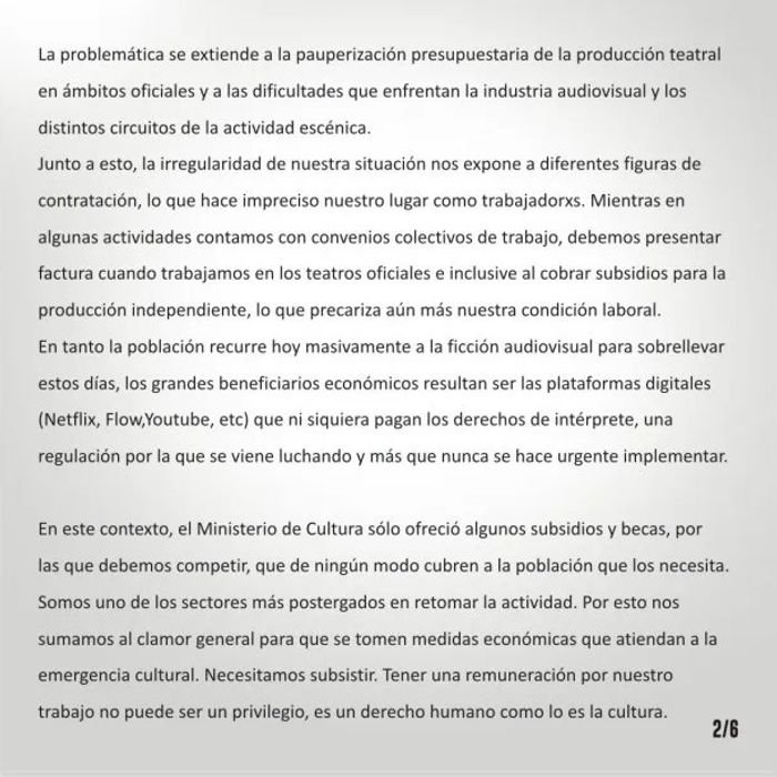 Cuando en Argentina se habla de la importancia de la cultura, nuestro rol como trabajadores no está claro para la sociedad“, comienza la carta que circuló por redes sociales y donde se advierte un “índice de desocupación histórica del orden del 90%”.