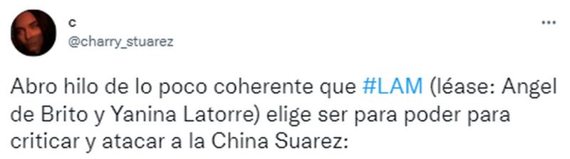 El hilo al que se refirió la actriz hace alusión a “las incoherencias que eligen Ángel de Brito y Yanina Latorre” para poder “atacar y criticar” a la China en “LAM”.