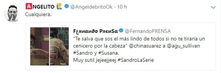“Avísenle a la China Suárez que el ‘me muero’ y el ‘los amo’ que dice Susana los dice hace 10 años… No, en esa época de Sandro. No sirve ni para actuar esta mina #SandroLaSerie”, opinó otra televidente en Twitter.