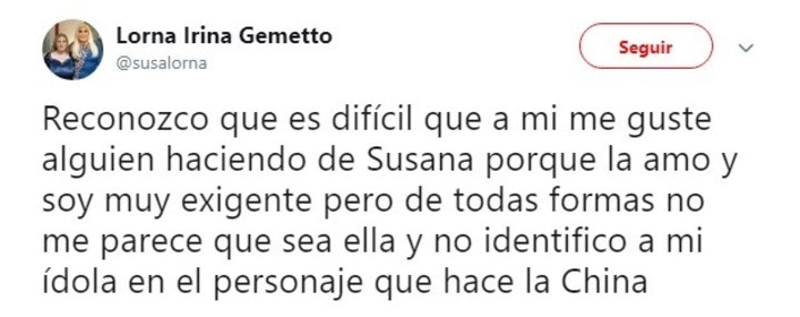 “Reconozco que es difícil que a mí me guste alguien haciendo de Susana porque la amo y soy muy exigente pero de todas formas no me parece que sea ella y no identifico a mi ídola en el personaje que hace la China”, escribió en Twitter la fan más conocida de la estrella de Telefe, Lorna Gemetto, quien también indicó que Lucía Celasco, la nieta de la diva, hubiese aprovechado ese papel mucho mejor que la China.