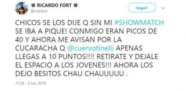 “¡Chicos se los dije que sin mí Showmatch se iba a pique! ¡¡Conmigo eran picos de 40 y ahora me avisan por la cucaracha que @cuervotinelli apenas llegás a los 10 puntos!! ¡Retirate y dejale espacio a los jóvenes! Ahora los dejo, besitos, chau chau”, publicaron desde la cuenta de Fort, aunque el mensaje fue borrado.