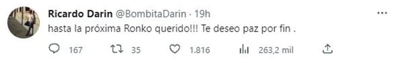 “¡Hasta la próxima, Ronko querido! Te deseo paz por fin”, expresó en un tuit el actor que cuenta con más de 400.000 seguidores. El sentido mensaje no pasó inadvertido entre sus seguidores.