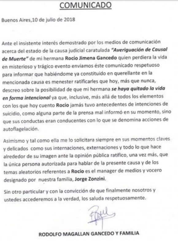 “Descreemos que se haya quitado la vida en forma intencional”, sostuvieron sus familiares. Y agregaron: “Ya que, inclusive, más allá de todos los elementos con los que hoy cuento, Rocío jamás tuvo antecedentes de intenciones de suicidio, como alguna parte de la prensa informó mal en su momento, sino que sus conductas eran conducentes con lo que se denomina acciones de autoflagelación”.
