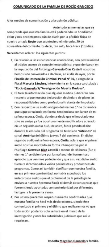 El comunicado, firmado por Rodolfo Magallán Gancedo y familia, aparece un día después de que se difundiera en Intrusos un nuevo audio de Rocío, esta vez enviado a una amiga suya. “Él es una bomba, no sé qué hacer”, se le escucha decir a la ex GH hablando de Díaz Castelli, luego de una primera entrevista como psicólogo. (Infobae)