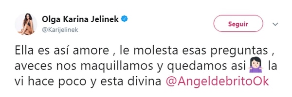 En medio de tantas críticas, quien saltó a defenderla fue Karina Jelinek, que explicó: “Ella es así, amor, le molestan esas preguntas, a veces nos maquillamos y quedamos así. La vi hace poco y está divina”.