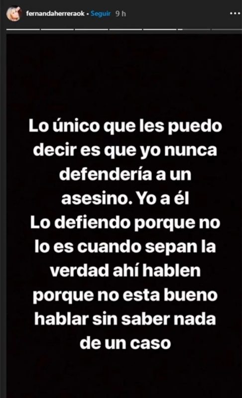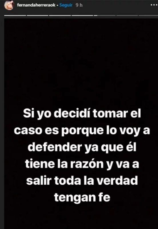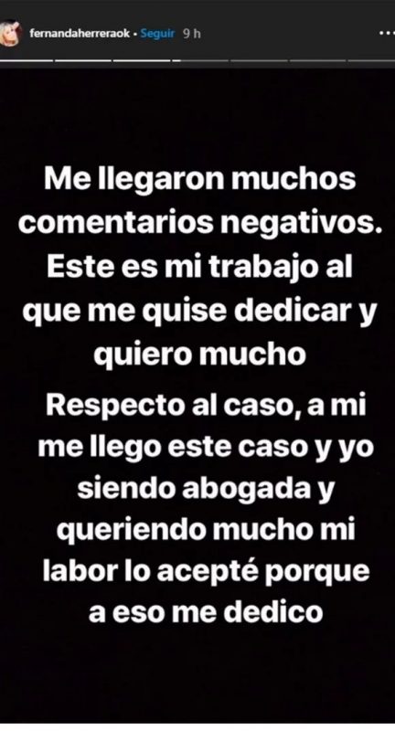 Por otra parte, Fernanda se refirió en su Instagram a las fuertes críticas que recibió tras aceptar la defensa de Velaztiqui: “Me llegaron muchos comentarios negativos. Este es mi trabajo, al que me quise dedicar y quiero mucho. Respecto al caso, me llegó y yo siendo abogada y queriendo mucho mi labor, lo acepté porque a eso me dedico. Si yo decidí tomar el caso es porque lo voy a defender ya que él tiene la razón y va a salir toda la verdad“.