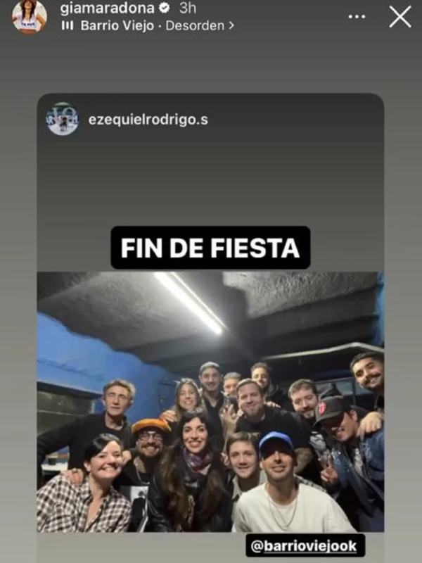 En su cuenta de Instagram, Gianinna compartió una imagen, donde está con amigos en común e integrantes de la banda Barrio Viejo, que integra Osvaldo. “Fin de fiesta”, escribió en la descripción de la publicación.