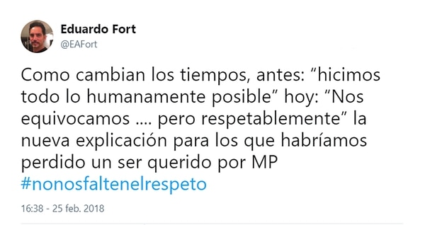 Eduardo Fort manifestó su indignación respecto a las explicaciones del médico del sanatorio, en el que también falleció su hermano Ricardo hace cinco años: “Como cambian los tiempos, antes: ‘Hicimos todo lo humanamente posible’. Hoy: ‘Nos equivocamos …. pero respetablemente’. La nueva explicación para los que habríamos perdido un ser querido por MP (mala praxis) #nonosfaltenelrespeto”.