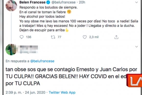 Ante las denuncias vecinales y las críticas de desconocidos en las redes sociales, la actriz cómica lanzó un explosivo tweet: “Respondo a los boludos de siempre. En el canal te toman la fiebre con termómetro. ¡Hay alcohol por todos lados! Yo soy obsesiva. Me lavo las manos 100 veces por días. No toco a nadie. Salí a trabajar, más que hay escasez, no a joder. Llegaba y directo a la ducha. Dejen de escupir para arriba“. Y agregó: “Cuídense, quédense en sus casas“.