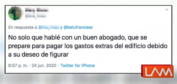 En ese conflictivo y alarmante contexto, Mery amenazó: “No solo que hable con un buen abogado, que se prepare para pagar los gastos extras del edificio debido a su deseo de figurar“.