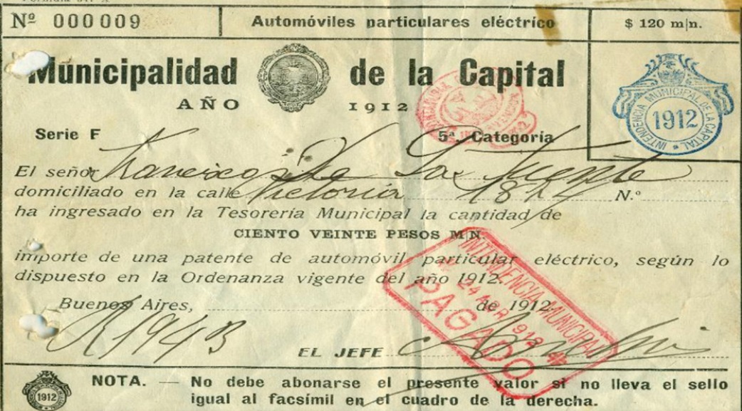 El documento histórico indica que el propietario del automóvil eléctrico, Francisco de la Fuente, tenía domicilio en la calle Victoria (hoy Hipólito Yrigoyen) 1814, en su cruce con la avenida Entre Ríos, y que pagó a la por entonces denominada Municipal de la Capital la suma de 120 pesos moneda nacional.