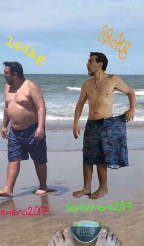 “El gorila que sale del mar ni se imagina todo lo que le va a pasar en los próximos meses. El flaco loco que lo mira reconociendo de dónde salió, no tiene idea de todo lo que se le viene. Los dos saben que todo es posible con amor, fe y voluntad. ¡Ellos dos, y varios más que convivimos dentro mío estamos agradecidos y felices!”, escribió en su cuenta de Facebook junto a una foto con el antes y después destacando que ahora pesa 89,6 kilos.