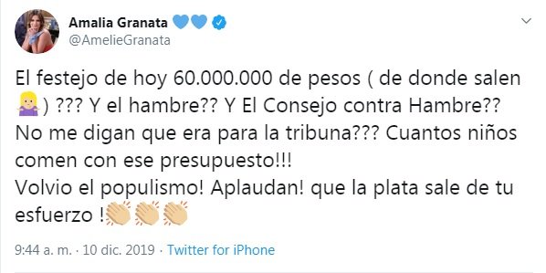 “El festejo de hoy 60.000.000 de pesos ( de donde salen?) ??? Y el hambre?? Y El Consejo contra Hambre?? No me digan que era para la tribuna??? Cuantos niños comen con ese presupuesto!!!”(sic), escribió.