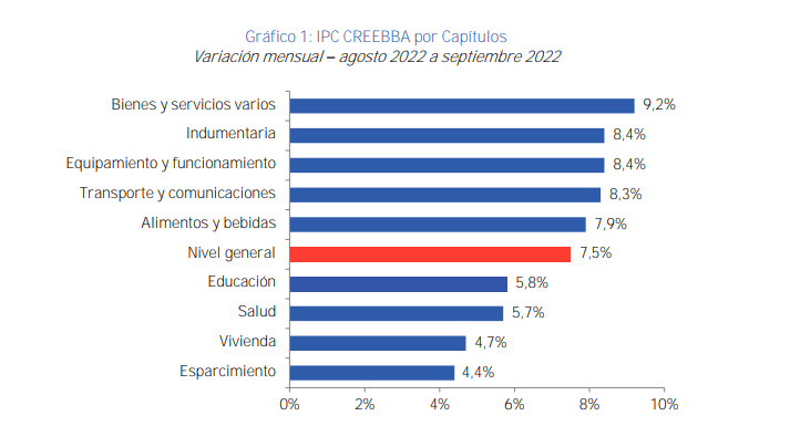 El Índice de Precios al Consumidor (IPC) elaborado por el CREEBBA aumentó un 7,5% en el mes de septiembre, según se informó este martes.
