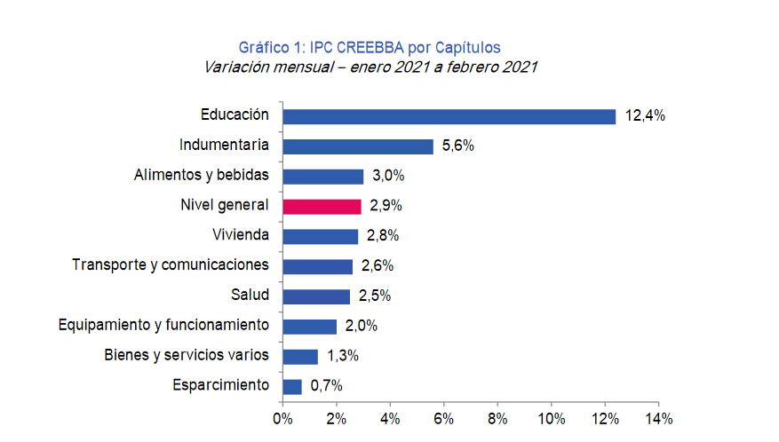 En febrero el Índice de Precios al Consumidor (IPC) que elabora el Creebba (Centro Regional de Estudios Económicos de Bahía Blanca) aumentó un 2,9% en relación con el mes anterior, disminuyendo su ritmo de crecimiento en comparación a enero.