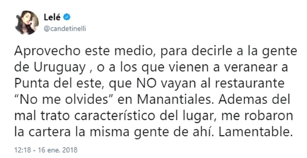 Candelaria Tinelli está de vacaciones con su familia en Punta del Este. Durante su estadía, la diseñadora contó en Twitter que pasó un mal momento cuando le extrajeron la cartera mientras se encontraba en un bar: “Me robaron la cartera la misma gente de ahí. Lamentable”.