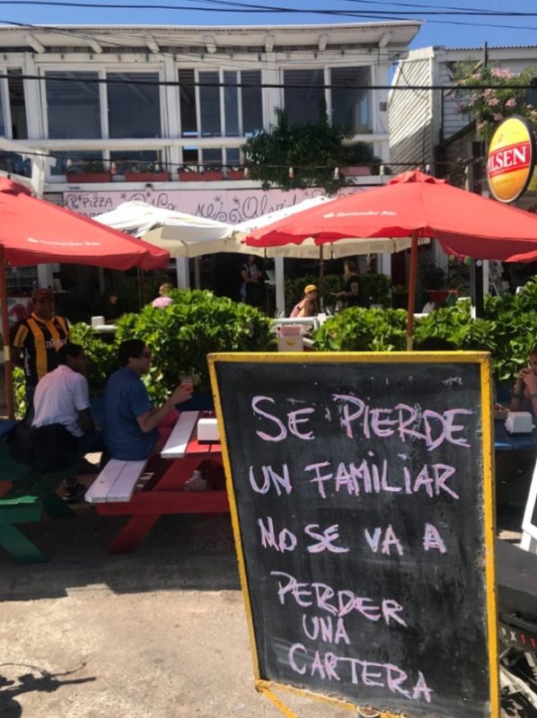 “Se roban carteras. Vengan de a uno, SHOMO NOSHOTRO”, escribió el joven, en tono irónico, en la red social. Unos días antes, habían puesto un cartel frente al local que decía: “Se pierde un familiar, no se va a perder una cartera”.