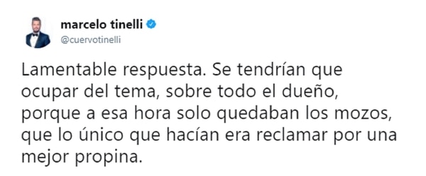 Tras esta declaración de Palacios, Marcelo Tinelli salió a defender a su hija: “Lamentable respuesta. Se tendrían que ocupar del tema, sobre todo el dueño, porque a esa hora solo quedaban los mozos, que lo único que hacían era reclamar por una mejor propina”.