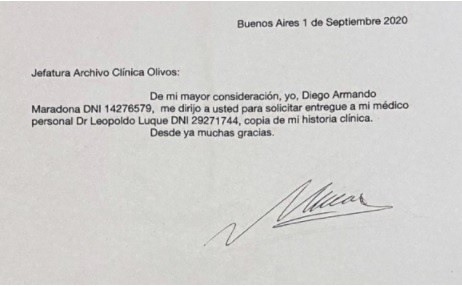Finalmente, luego de una exhaustiva investigación se confirmó a través de un peritaje caligráfico que la firma de Diego Maradona es falsa y se complicó la situación del neurocirujano. La historia clínica fue solicitada el 1 de septiembre de 2020 en el cual supuestamente Diego le daba permiso a su médico para recibir su historia clínica.
