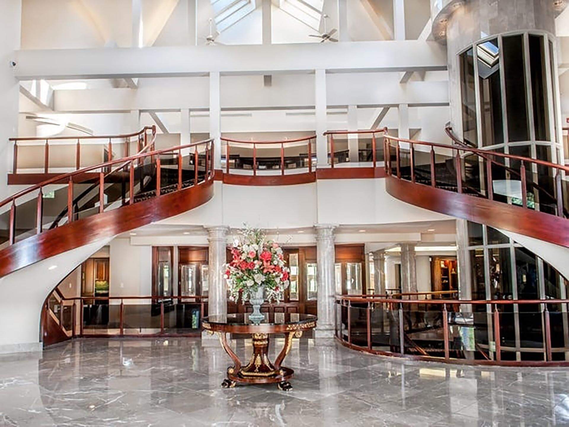 La mansión, de más de de 5 mil metros cuadrados, cuenta con 21 habitaciones, 25 baños, una piscina techada, una bañera de hidromasaje, librería y gimnasio. Además, poseía canchas de básquet y ráquetbol techadas. Pero lo que más llamaba la atención sin duda era su parte dedicada a la diversión que comprendía e un estudio de grabación, un cine, salas de juegos, casino y hasta una discoteca, a la que acudieron algunas de las personalidades más reconocidas.