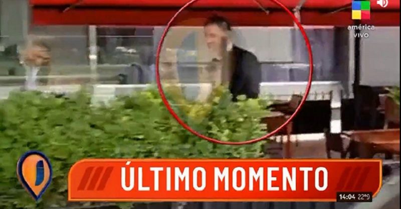 Se lo puede apreciar con su look y rasgos físicos habituales, vestido de traje y sentado en una mesa sobre la vereda.