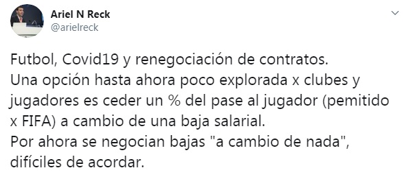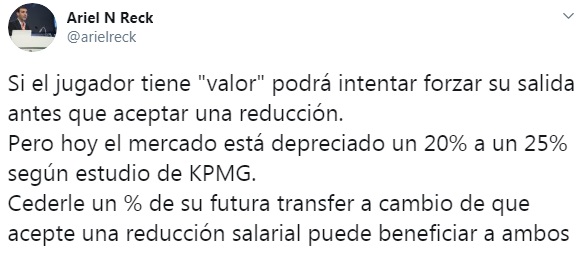 Y explicó: “Si el jugador tiene valor, podrá intentar forzar su salida antes que aceptar una reducción, pero hoy el mercado está devaluado de un 20 a un 25% según estudios. Entonces un porcentaje de futura transferencia a cambio de una reducción salarial puede beneficiar a ambos”.