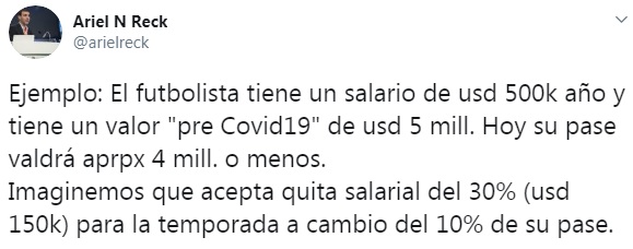 Por ejemplo, si un futbolista gana $500.000 y antes de la pandemia su valor de mercado era de $5.000.000, hoy su pase puede valer menos de cuatro millones. Si acepta una rebaja del 30% de su sueldo a cambio del 10% de su pase, dejará de ganar $150.000 en un año, pero si para dentro de un año la situación se normaliza y el futbolista es transferido por su valor original, ganará $500.000, mucho más que los 150.000 que resignó de sueldo.