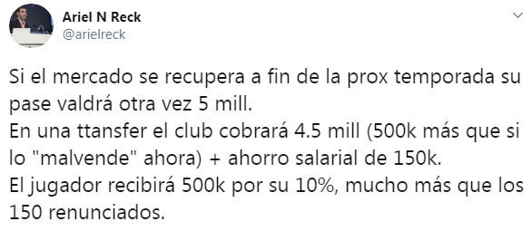 Lo cierto es que Ariel Reck, un abogado especialista en derecho deportivo, compartió en las últimas horas una alternativa que podría servirle a ambas partes en este contexto: que los clubes le cedan un porcentaje del pase al jugador, algo que está permitido por la FIFA, a cambio de una rebaja. “Por ahora se negocian bajas a cambio de nada, difíciles de acordar”, indicó.