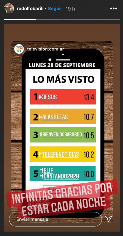 Y Barili no se quedó atrás. En su posteo, el periodista expresó: «Infinitas gracias por estar cada noche». El próximo lunes a las 22:30 no sólo comenzará Masterchef Celebrity Argentina, sino también Telefe estrenará Fuerza de mujer, una nueva novela brasilera que se emitirá a las 21:45. Como consecuencia, el noticiero que conduce Pérez se verá hasta las 21:15, antes del inicio de Jesús.