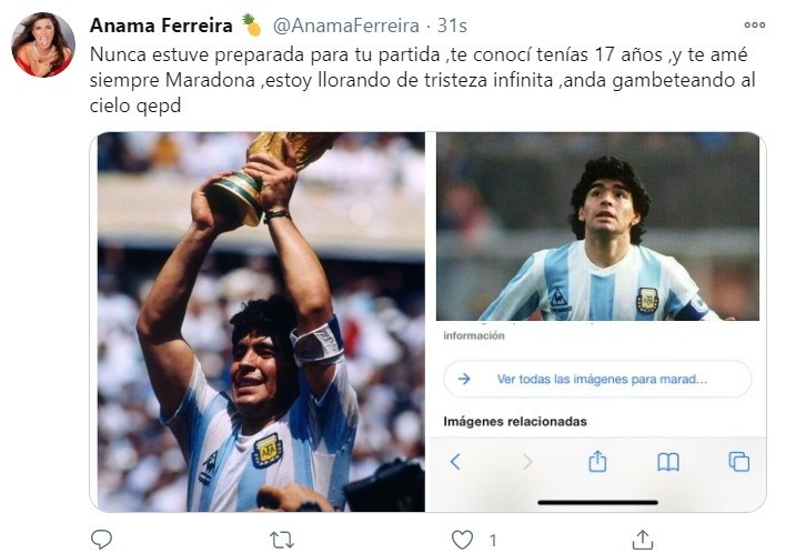 Además Anamá manifestó conmovida: “Nunca estuve preparada para tu partida. Cuando te conocí tenías 17 años y te amé siempre Maradona. Estoy llorando de tristeza infinita“.