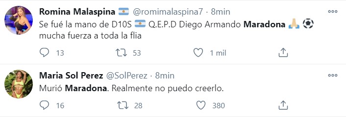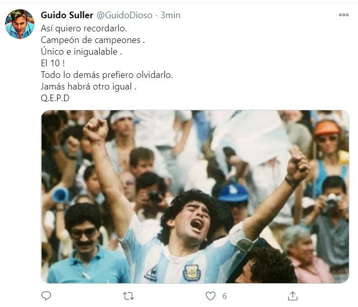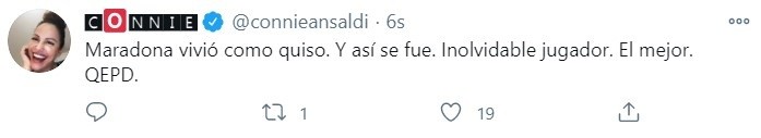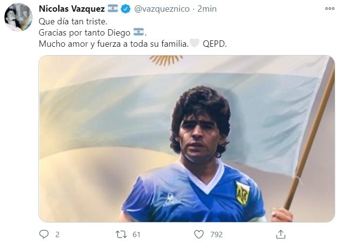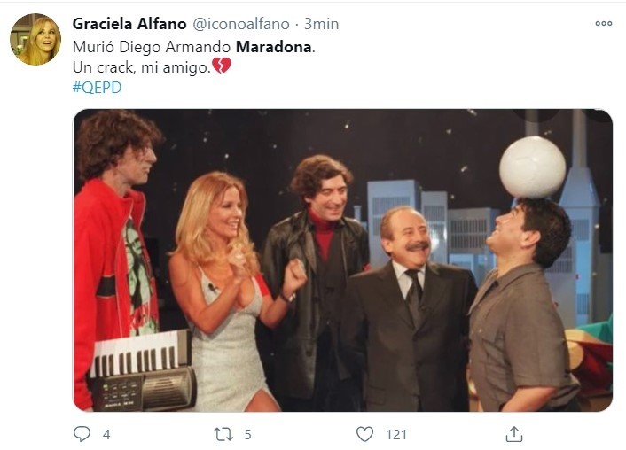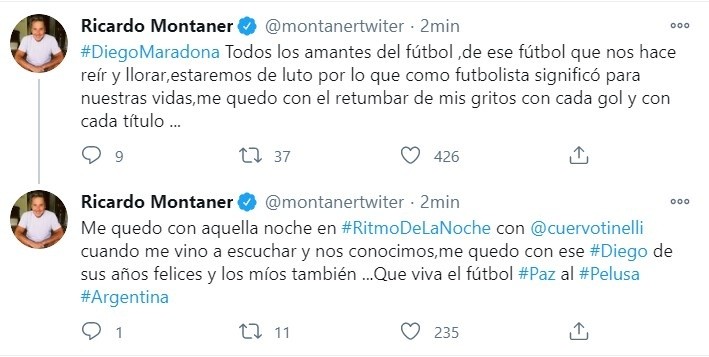 “Murió Diego Armando Maradona. Un crack, mi amigo“, escribió Grace. Por su parte, Montaner expresó con tristeza: “Todos los amantes del fútbol, de ese fútbol que nos hace reír y llorar, estaremos de luto por lo que como futbolista significó para nuestras vidas, me quedo con el retumbar de mis gritos con cada gol y con cada título“.