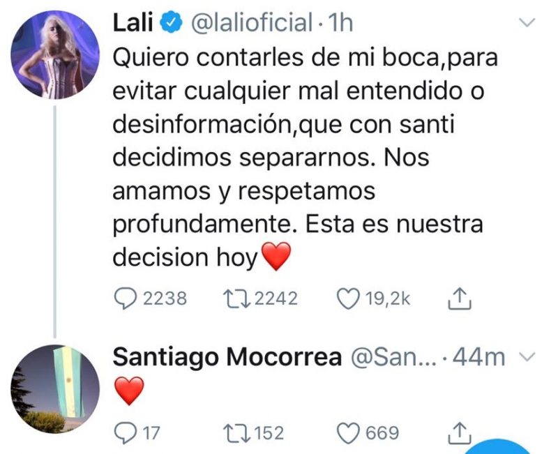 Este lunes, después de varios días de rumores surgidos entre sus propios fans, Lali Espósito blanqueó su separación de Santiago Mocorrea. A través de su cuenta de Twitter, aseguró que había sido algo de mutuo acuerdo y aclaró: “Nos amamos y respetamos profundamente”.