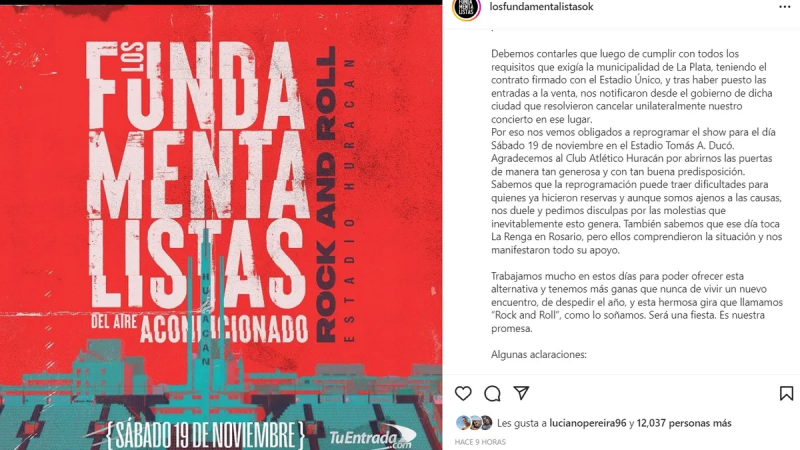 Debemos contarles que luego de cumplir con todos los requisitos que exigía la municipalidad de La Plata, teniendo el contrato firmado con el Estadio Único, y tras haber puesto las entradas a la venta, nos notificaron desde el gobierno de dicha ciudad que resolvieron cancelar unilateralmente nuestro concierto en ese lugar“, comenzó el comunicado del grupo Los Fundamentalistas del Aire Acondicionado anunciando el cambio de escenario de La Plata a CABA para el show de noviembre.