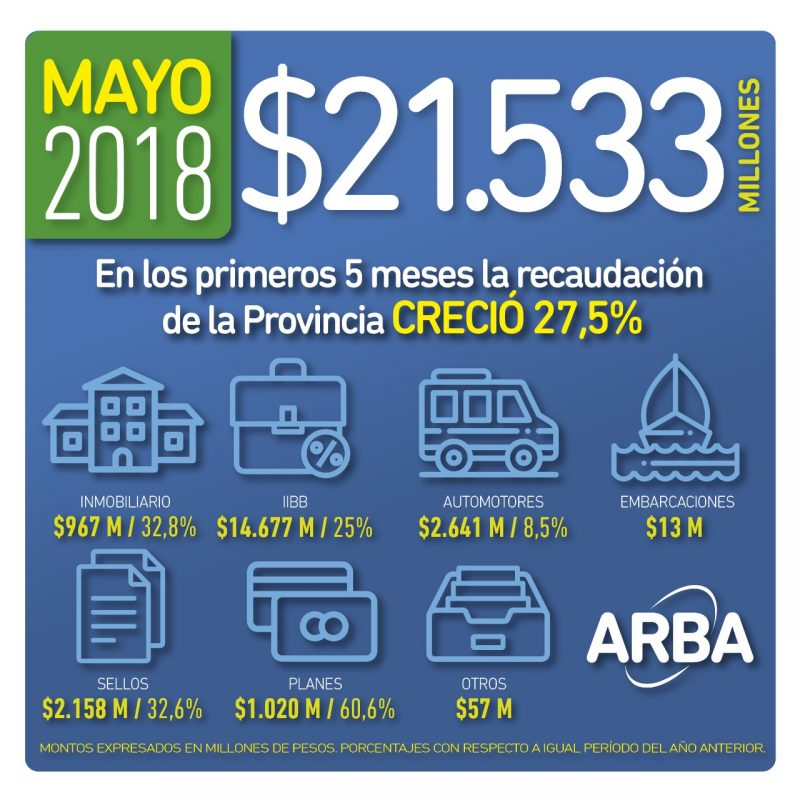 Teniendo en cuenta lo obtenido durante el último mes, la recaudación propia de la Provincia en el período enero-mayo de 2018 asciende a $108.003 millones, lo que significa una variación interanual positiva del 27,5%.